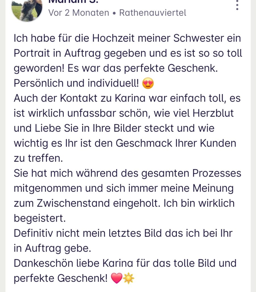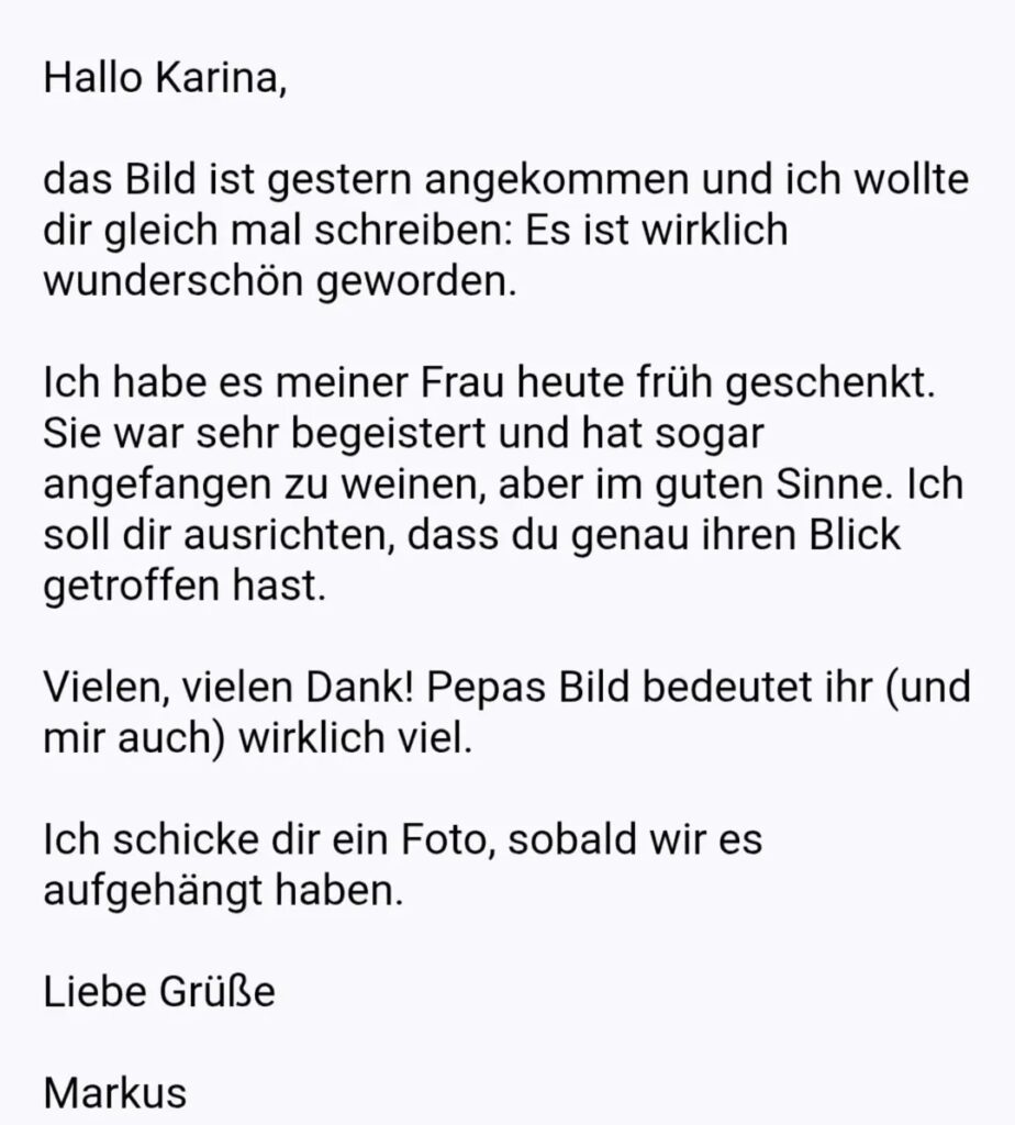 Du brauchst keine feste Vorstellung. Schreib mir einfach unverbindlich. Ich zeige dir dann, was möglich ist und berate dich, damit das Portrait zu deinen Wünschen passt.